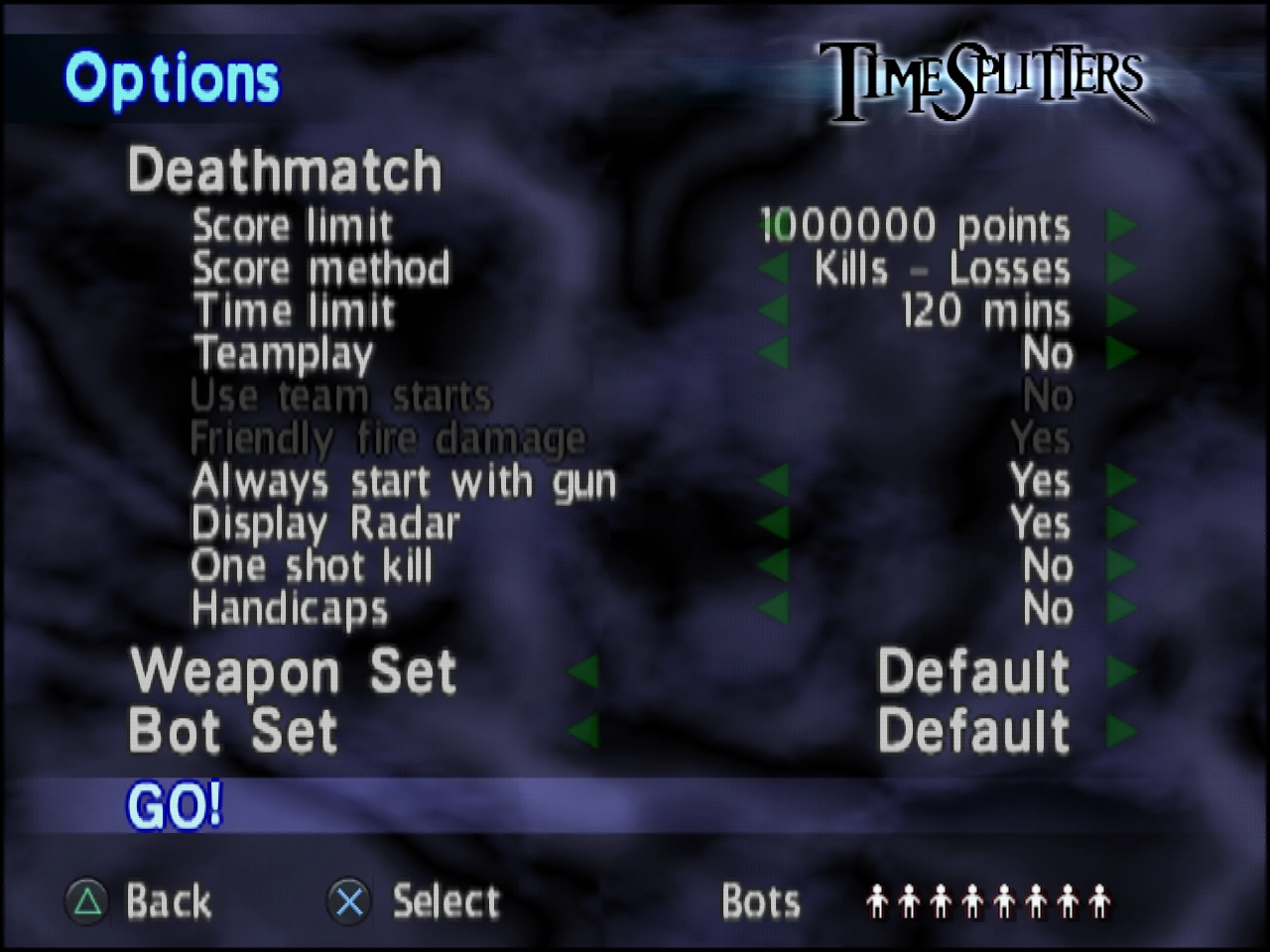 TimeSplitters Deathmatch · Team Deathmatch · Capture the Bag · BagTag · Escort · Last Stand · Knockout