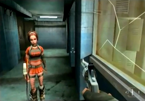 Avoid the flying boxes (or let Jo-Beth trip them all). Grab the revolver ammo (you'll need it) and follow the tunnel. Have the revolver equipped. The green pit has no enemies and Cortez will be in for a "surprise" after falling through the floor. Just be sure to have a revolver ready (aimed at what looks like Jo-Beth) and back away quickly (easy to tell if she's NOT the real one if the crosshair turns red) or just shoot her head quickly BEFORE she reacts. Deal with the enemies and meet up with Jo-Beth. Before entering the morgue to help her, TK grab the shotgun laying against the railing so you have extra ammo for fending off the zombies. Protect Jo-Beth from zombies by killing them all and grabbing the extra shells under the stairs.